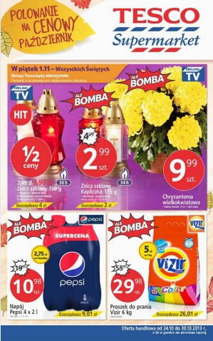 Nowa gazetka promocyjna Tesco - "Polowanie na cenowy październik". Polecane promocje z gazetki Tesco: Znicz szklany 150 g - 3,99 zł. Chryzantema wielokwiatowa w doniczce - 9,99 zł. Proszek do prania Vizir 6 kg - 29,98 zł. …