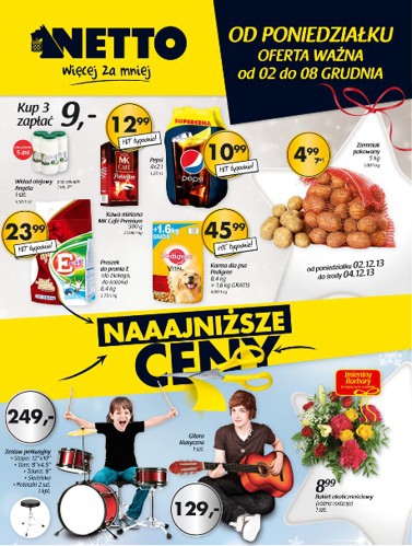 {loadposition linkNetto} Nowa gazetka promocyjna Netto - "Naaajniższe ceny". Polecane promocje z gazetki Netto: Pepsi 4x2 L - 10,99 zł. Proszek do prania E 6,4 kg - 23,99 zł. Gitara klasyczna - 129 zł. Oferta ważna od…