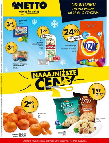 {loadposition linkNetto} Nowa gazetka promocyjna Netto - "Naaajniższe ceny". Polecane promocje z gazetki Netto: Proszek do prania Vizir 5 kg - 24,99 zł. Piwo Kasztelan Niepasteryzowane 500 ml - 1,79 zł. Mandarynki 1 kg - 2,49 zł. …