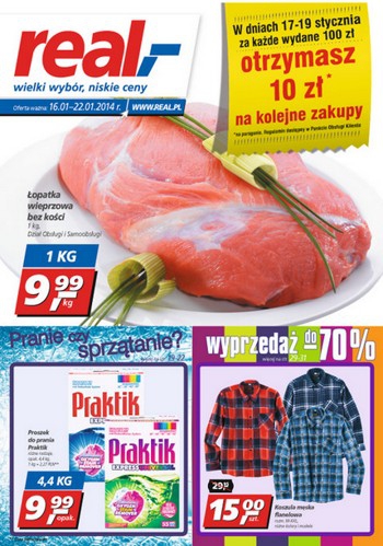 Nowa gazetka promocyjna sieci handlowej Real. Polecane promocje z gazetki Real: Łopatka wieprzowa bez kości 1 kg - 9,99 zł. Proszek do prania Praktik 4,4 kg - 9,99 zł. Koszula męska flanelowa - 15 zł. W dniach…