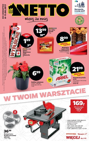 {loadposition linkNetto} Nowa gazetka promocyjna Netto - "W Twoim warsztacie". Polecane promocje z gazetki Netto: Pilarka tarczowa stołowa - 169 zł. Proszek do prania Ariel 2,625 kg - 21,99 zł. Ser żółty Gouda 1 kg - 13,99…