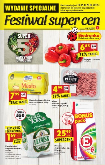 {loadposition linkBiedronka} Nowa gazetka promocyjna sieci handlowej Biedronka - "Festiwal super cen". Polecane promocje z gazetki sieci Biedronka: Olej Kujawski rzepakowy 2 L - 9,49 zł. Papier toaletowy Queen Komfort 10 rolek - 9,99 zł. Proszek do prania Vizir…