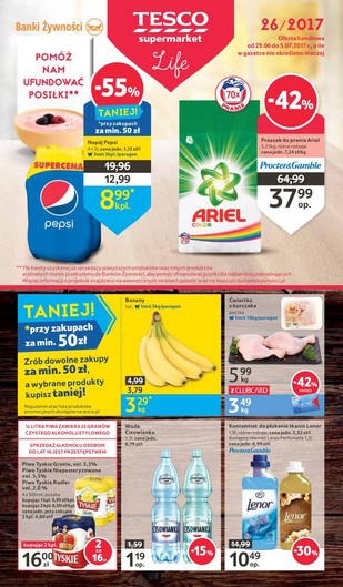 Nowa gazetka promocyjna Tesco. Polecane promocje z gazetki Tesco: Proszek do prania Ariel 5,25 kg - 37,99 zł. Ćwiartka z kurczaka 1 kg - 3,49 zł*. Woda Cisowianka 1,5 L - 1,19 zł. * - cena…