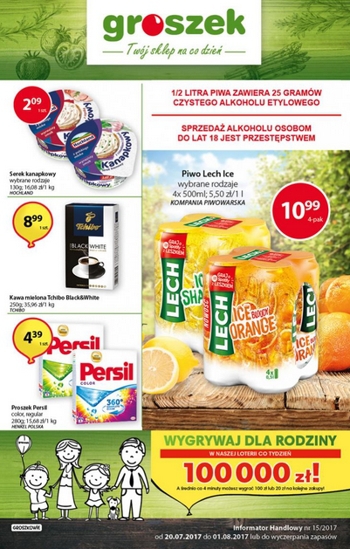 {loadposition linkGroszek} Nowa gazetka promocyjna sieci handlowej Groszek. Polecane promocje z gazetki Groszek: Piwo Lech Ice 4x500 ml - 10,99 zł. Serek kanpakowy Hochland 130 g - 2,09 zł. Proszek do prania Persil 280 g - 4,39 zł.…