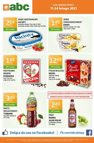 {loadposition linkABC} Nowa gazetka promocyjna sieci sklepów ABC. Polecane promocje z gazetki ABC: Serek śmietankowy Łaciaty 135 g - 2,59 zł. Serek homogenizowany Danio 135 g - 1,49 zł. Przyprawa Vegeta Podravka 75 g - 1,49 zł. …