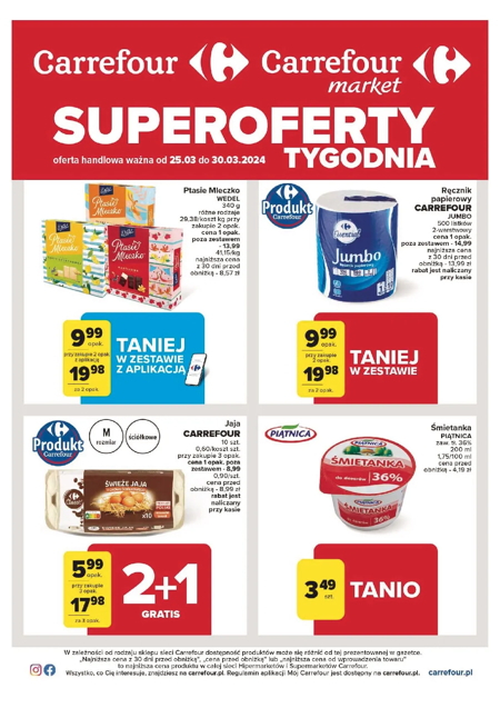 'Superoferty tygodnia' - nowa gazetka promocyjna sieci marketów Carrefour. Polecane promocje z gazetki Carrefour: Ptasie mleczko Wedel 2x340 g - 19,99 zł*. Ręcznik papierowy Carrefour Jumbo 2 sztuki - 19,99 zł. Śmietanka Piątnica 200 ml - 3,49 zł. …