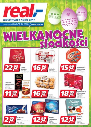 Nowa gazetka promocyjna sieci handlowej Real - "Wielkanocne słodkości i gotowanie". Polecane promocje z gazetki Real: Lindor Milk Box Lindt 150 g - 22,95 zł. Raffaello 240 g - 16,99 zł. Przyprawy Galeo - 0,89 zł. Oferta…