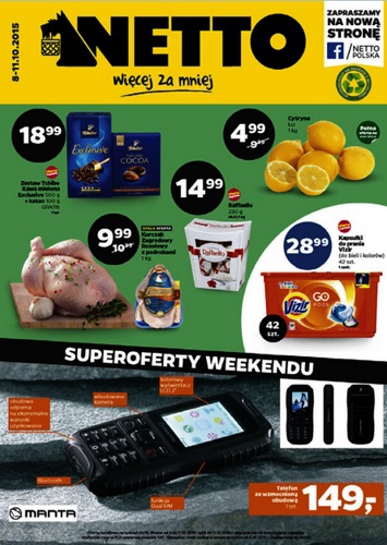 {loadposition linkNetto} Nowa gazetka promocyjna Netto - "Superoferty weekendu". Polecane promocje z gazetki Netto: Telefon ze wzmocnioną obudową - 149 zł. Kapsułki do prania Vizir 42 sztuki - 28,99 zł. Raffaello 230 g - 14,99 zł. Oferta…