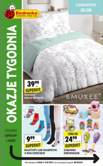 {loadposition linkBiedronka} 'Okazje tygodnia' - nowa gazetka promocyjna sieci sklepów Biedronka. Polecane promocje z gazetki sieci Biedronka: Kołdra dwustronna Smukee - 39,99 zł. Rajstopy lub skarpetki dziecięce 3-pak - 9,99 zł. Zabawki drewniane - od 24,99 zł. …
