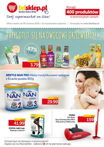 {loadposition linkBdsklep} Nowa gazetka promocyjna supermarketu internetowego Bdsklep.pl. Polecane promocje z gazetki Bdsklep.pl: Mleko modyfikowane następne z B.Lactis dla dzieci powyżej 1 roku NESTLE NAN PRO 3 800 g - 29,99 zł. Rajstopy uciskowe Scholl Light Legs - 41,99…