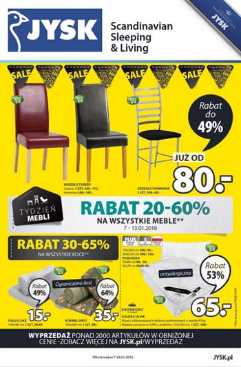 Nowa gazetka promocyjna JYSK. Polecane promocje z gazetki Jysk: Rabat 20-60% na wszystkie meble. Rabat 30-65% na wszystkie koce. Rabat 25-55% na wszystkie ramki na zdjęcia. Oferta ważna od 7.01 do 20.01.