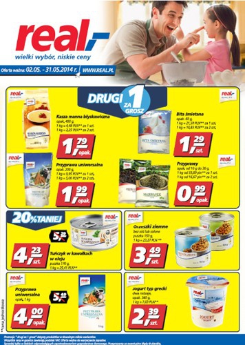 Nowa gazetka promocyjna sieci handlowej Real - "Drugi za 1 grosz". Polecane promocje z gazetki Real: Kasza manna błyskawiczna Real Quality 2x400 g - 1,80 zł. Przyprawa uniwersalna Real Quality 2x200 g - 2 zł. Oliwka dla dzieci…