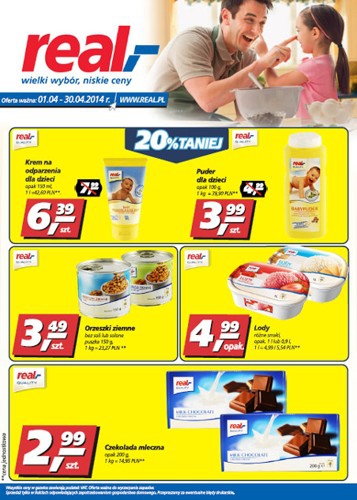 Nowa gazetka promocyjna sieci handlowej Real - "20% taniej". Polecane promocje z gazetki Real: Krem na odparzenia dla dzieci Real Quality 150 ml - 6,39 zł. Puder dla dzieci Real Quality 100 g - 3,99 zł. Czekolada mleczna…