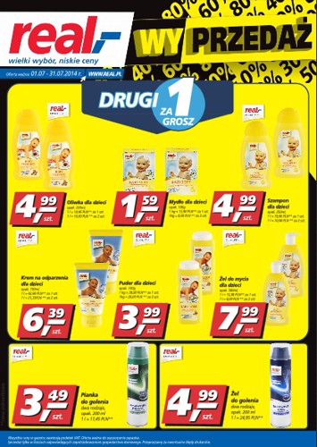 Nowa gazetka promocyjna sieci handlowej Real - "Wyprzedaż". Polecane promocje z gazetki Real: Oliwka dla dzieci Real Quality 250 ml - 4,99 zł. Mydło dla dzieci Real Quality 100 g - 1,59 zł. Szampon dla dzieci Real Quality…