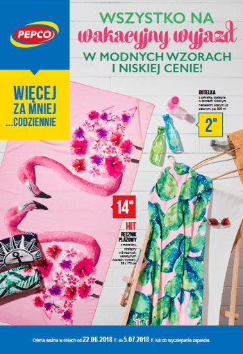 'Wszystko na plażę' - nowa gazetka promocyjna sieci sklepów Pepco. Polecane promocje z gazetki Pepco: Strój kąpielowy dziewczęcy 2-częściowy - 20 zł. Góra lub dół od bikini - od 15 zł. Ręcznik plażowy 86x170 cm - 15 zł. …
