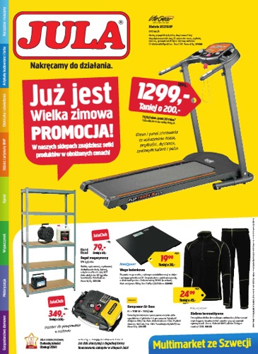 {loadposition linkJula} Nowa gazetka promocyjna sieci handlowej Jula - "Już jest Wielka zimowa promocja!". Polecane promocje z gazetki Jula: Bieżnia 97276HP - 1299 zł. Waga łazienkowa - 19,99 zł. Regał magazynowy - 79 zł. Oferta ważna od 2.01…