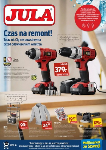 {loadposition linkJula} 'Czas na remont!. Teraz nic Cię nie powstrzyma przed odświeżeniem wnętrza' - nowa gazetka promocyjna sieci handlowej Jula. Polecane promocje z gazetki Jula: Zestaw wiertarko-wkrętarek Meec Tools 18 V 2x2 Ah - 379 zł*. Regał metalowy Hard…