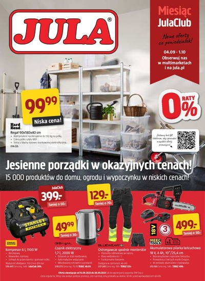 'Jesienne porządki w okazyjnych cenach! 15 000 produktów do domu, ogrodu i wypoczynku w niskich cenach!' - nowa gazetka promocyjna sieci handlowej Jula. Polecane promocje z gazetki Jula: Regał Hard Head 90x180x40 cm - 99,99 zł. Kompresor Stanley 6…