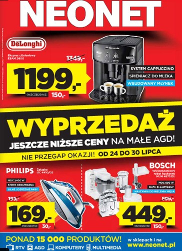 {loadposition linkNeonet} Nowa gazetka promocyjna Neonet - "Wyprzedaż - jeszcze niższe ceny na małe AGD". Polecane promocje z gazetki Neonet: Ekspres ciśnieniowy DeLonghi ESAM 2600 - 1199 zł. Robot kuchenny BOSCH MUM 4875 EU - 449 zł. Żelazko PHILIPS…