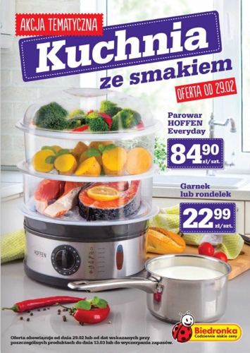 {loadposition linkBiedronka} Nowa gazetka promocyjna sieci handlowej Biedronka - "Kuchnia ze smakiem". Polecane promocje z gazetki sieci Biedronka: Parowar Hoffen Everyday - 84,90 zł. Garnek lub rondel - 22,99 zł. Czajnik emaliowany - 44,99 zł. Oferta ważna od…