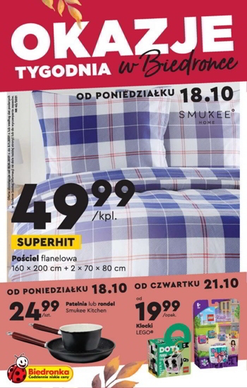 {loadposition linkBiedronka2} 'Okazje tygodnia' - nowa gazetka promocyjna sieci sklepów Biedronka. Polecane promocje z gazetki sieci Biedronka: Pościel flanelowa Smukee Home - 49,99 zł. Patelnia lub rondel Smukee Kitchen - 24,99 zł. Klocki LEGO - od 19,99 zł. …
