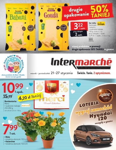 {loadposition linkIntermarche} Nowa gazetka promocyjna sieci sklepów Intermarche Polecane promocje z gazetki Intermarche: Ser żółty Serenada w plastrach 2x135 g - 6,44 zł. Bombonierka Merci 250 g - 10,99 zł. Róża w doniczce - 7,99 zł. …