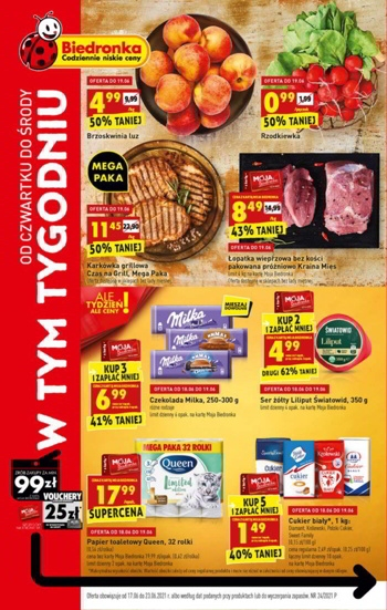 {loadposition linkBiedronka2} 'W tym tygodniu' - nowa gazetka promocyjna sieci sklepów Biedronka. Polecane promocje z gazetki sieci Biedronka: Rzodkiewka 1 pęczek - 0,99 zł. Jabłka polskie 1 kg - 1,39 zł. Karkówka lub szynka wieprzowa bez kości pakowana próżniowo…
