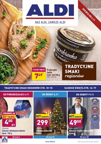 {loadposition linkAldi} 'Tradycyjne smaki regionów' - nowa gazetka promocyjna Aldi. Polecane promocje z gazetki Aldi: Tradycyjne Jadło w słoiku 160 g - 7,49 zł. Salami międzynarodowe Tremondi 100 g - 4 zł. Choinka sztuczna Living Art…
