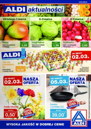 {loadposition linkAldi} Nowa gazetka promocyjna Aldi. Polecane promocje z gazetki Aldi: Sałata lodowa 1 sztuka - 1,99 zł. Jajeczka czekoladowe 1 kg - 19,90 zł. Patelnia z powłoką ILAG - 39 zł. Oferta ważna od 2.03 do wyczerpania…