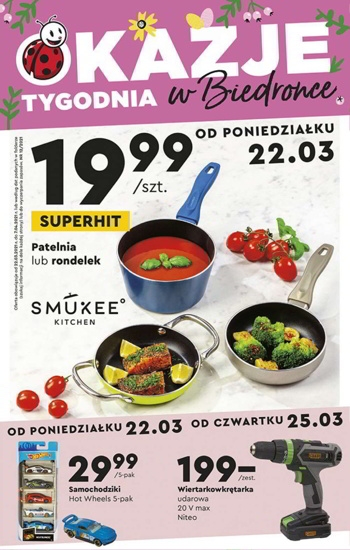{loadposition linkBiedronka5} 'Okazje tygodnia' - nowa gazetka promocyjna sieci sklepów Biedronka. Polecane promocje z gazetki sieci Biedronka: Patelnia lub rondelek Smukee Kitchen 1 sztuka - 19,99 zł. Samochodziki Hot Whells 5-pak - 29,99 zł. Wiertarkowkrętarka udarowa Niteo Tools 20…