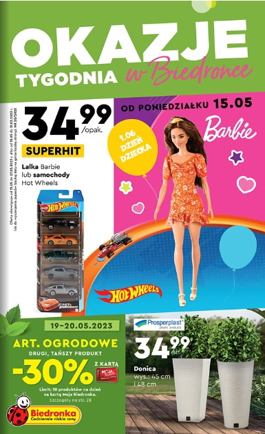 {loadposition linkBiedronka4} 'Okazje tygodnia' - nowa gazetka promocyjna sieci sklepów Biedronka. Polecane promocje z gazetki sieci Biedronka: Lalka Barbie lub samochodziki Hot Whells - 34,99 zł. Donica Prosperplast - 34,99 zł. Kudłate zwierzątko Elefun - 24,99 zł. …