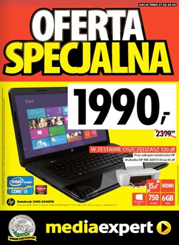 {loadposition linkMediaExpert} Nowa gazetka promocyjna Media Expert - "Oferta specjalna". Polecane promocje z gazetki Media Expert: Notebook HP 2000-2D30EW - 1990 zł. Telewizor LED 3D 55" SONY KDL-55W809 - 5499 zł. Smartfon SAMSUNG GT-I9505 GALAXY S4 - 1899 zł.…