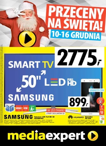 {loadposition linkMediaExpert} Nowa gazetka promocyjna Media Expert - "Przeceny na Święta!". Polecane promocje z gazetki Media Expert: Telewizor LED 3D 50" SAMSUNG UE50H6400 - 2775 zł. Smartfon HUAWEI P8 LITE - 899 zł. Telewizor LED 32" SAMSUNG UE32J4000 -…