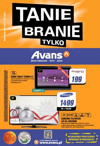 Nowa gazetka promocyjna Avans - "Tanie branie tylko". Polecane promocje z gazetki Avans: Tablet KIANO Young IIS - 199 zł Telewizor LED 40" SAMSUNG UE40EH5000 - 1499 zł. Telewizor LED 3D 42" LG 42LA667S - 2699 zł. …