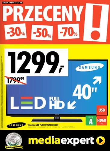 {loadposition linkMediaExpert} Nowa gazetka promocyjna Media Expert - "Przeceny!". Polecane promocje z gazetki Media Expert: Telewizor LED 40" SAMSUNG UE40EH5000 - 1299 zł. Notebook TOSHIBA C50-A-19T - 1499 zł. Zmywarka do zabudowy ELECTROLUX ESL 6361LO - 1499 zł. …