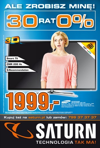 {loadposition linkMediaMarkt} Nowa gazetka promocyjna Saturn - "30 rat 0%". Polecane promocje z gazetki Saturn: Telewizor LED 40" SAMSUNG UE40F6320 - 1999 zł. Telewizor LED 50" SONY KDL-50W656A - 3599 zł. Tablet SAMSUNG Galaxy Tab 3 10.1 16GB -…