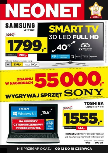 {loadposition linkNeonet} Nowa gazetka promocyjna Neonet - "Zgarnij w nagrodach 55 000". Polecane promocje z gazetki Neonet: Telewizor LED 3D 40" SAMSUNG UE40F6320 - 849 zł. Laptop TOSHIBA C55-A-1RH - 1555 zł. Telewizor LED 3D 48" SAMSUNG UE48H6400 -…