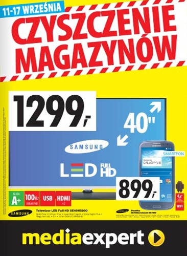 {loadposition linkMediaExpert} Nowa gazetka promocyjna Media Expert - "Czyszczenie magazynów". Polecane promocje z gazetki Media Expert: Telewizor LED 40" SAMSUNG UE40H5000 - 1299 zł. Smartfon SAMSUNG GT-I9301i GALAXY SIII NEO - 899 zł. Telewizor LED 3D 40" SAMSUNG UE40H6270…