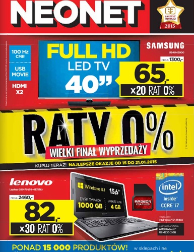 {loadposition linkNeonet} Nowa gazetka promocyjna Neonet - "Teraz kupuj taniej!". Polecane promocje z gazetki Neonet: Telewizor LED 40" SAMSUNG UE40H5000 - 1299 zł. Smartfon Telefunken TE Enjoy + starter Play - 149 zł. Laptop Lenovo G50-80 - 1799 zł.…