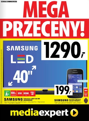 {loadposition linkMediaExpert} Nowa gazetka promocyjna Media Expert - "Mega przeceny!". Polecane promocje z gazetki Media Expert: Telewizor LED 40" SAMSUNG UE40H5000 - 1290 zł. Smartfon SM-G110 SAMSUNG GALAXY POCKET 2 - 199 zł. Gra FIFA 15 - 129 zł.…