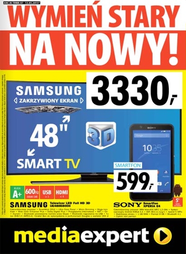 {loadposition linkMediaExpert} Nowa gazetka promocyjna Media Expert - "Wymień stary na nowy!". Polecane promocje z gazetki Media Expert: Telewizor Curved TV 48" SAMSUNG UE48H6800H - 3330 zł. Smartfon SONY XPERIA E4 - 599 zł. Wieża PHILIPS BTM 1360 -…