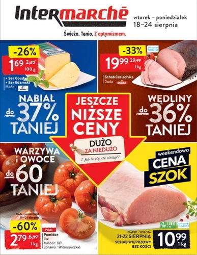 {loadposition linkIntermarche2} 'Jeszcze niższe ceny. Dużo za niedużo. I jak tu się nie cieszyć!' - nowa gazetka promocyjna sieci sklepów Intermarche Polecane promocje z gazetki Intermarche: Ser Gouda Mońki 100 g - 1,69 zł. Schab Czeladnika Duda 1 kg…