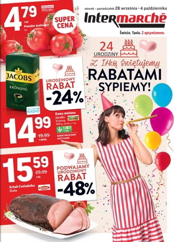 {loadposition linkIntermarche} 'Z Irką świętujemy rabatmi sypiemy!' - nowa gazetka promocyjna sieci sklepów Intermarche Polecane promocje z gazetki Intermarche: Pomidory malinowe 1 kg - 4,79 zł. Kawa mielona Jacobs Kronung 500 g - 14,99 zł. Schab Czeladnika Duda 1…
