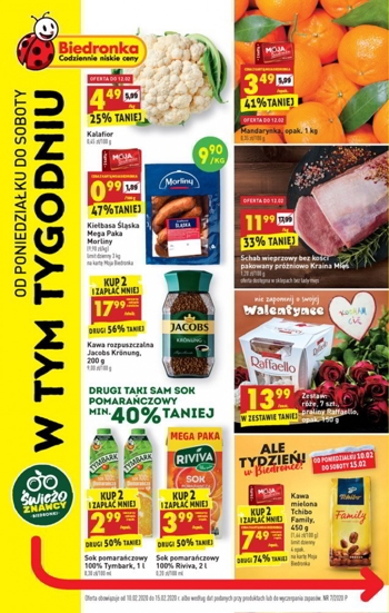'W tym tygodniu' - nowa gazetka promocyjna sieci sklepów Biedronka. Polecane promocje z gazetki sieci Biedronka: Kalafior 1 kg - 4,49 zł. Mandarynki 1 kg - 3,49 zł*. Schab wieprzowy bez kości pakowany próżniowo Kraina Mięs 1…