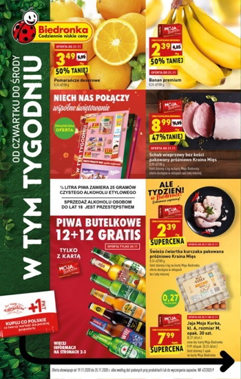 {loadposition linkBiedronka2} 'W tym tygodniu' - nowa gazetka promocyjna sieci sklepów Biedronka. Polecane promocje z gazetki sieci Biedronka: Pomarańcze deserowe 1 kg - 3,49 zł. Banany premium 1 kg - 2,39 zł*. Schab wieprzowy bez kości pakowany próżniowo Kraina…