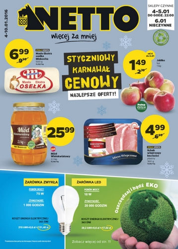 {loadposition linkNetto} Nowa gazetka promocyjna Netto - "Styczniowy karnawał cenowy". Polecane promocje z gazetki Netto: Masło Ekstra osełka Mlekovita 500 g - 6,99 zł. Miód Wielokwiatowy 2,1 kg - 25,99 zł. Schab wieprzowy bez kości plastry 360 g…