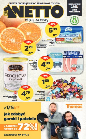 {loadposition linkNetto} Nowa gazetka promocyjna sieci sklepów Netto. Polecane promocje z gazetki Netto: Pomarańcze 1 kg - 2,79 zł. Zupa grochowa z wędzonką Kuchnia Staropolska 800 g - 4,79 zł. Schab wieprzowy bez kości w plastrach 360 g…