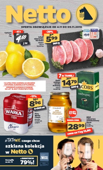 Nowa gazetka promocyjna sieci sklepów Netto. Polecane promocje z gazetki Netto: Cytryny 1 kg - 4,69 zł. Schab wieprzowy bez kości w plastrach 360 g - 5,99 zł. Piwo Warka Classic 4x500 ml - 8,96 zł.…