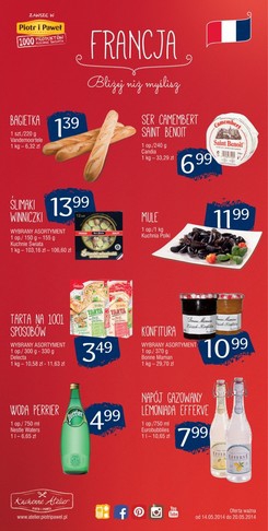 Nowa gazetka promocyjna sieci sklepów Piotr i Paweł - "Francja bliżej niż myślisz". Polecane promocje z gazetki Piotr i Paweł: Ser Camembert Saint Benoit 240 g - 6,99 zł. Ślimaki winniczki 150 g - 13,99 zł. Mule 1…