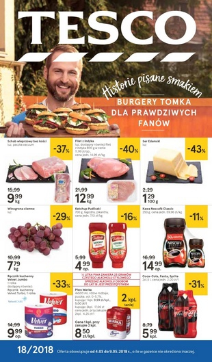 'Historie pisane smakiem - burgery Tomka dla prawdziwych fanów' - nowa gazetka promocyjna sieci sklepów Tesco. Polecane promocje z gazetki Tesco: Schab wieprzowy bez kości 1 kg - 9,99 zł. Filet z indyka 1 kg - 12,99 zł.…